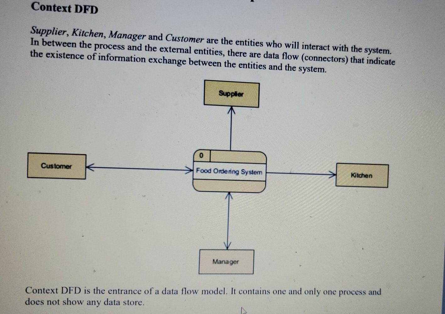 To create new DFD, select Diagram > New from the toolbar. In the New Diagram window, select Data Flow Diagram and click Next. Enter Context as diagram name and click OK to confirm. We'll now draw the first process. From the Diagram Toolbar, drag Process onto the diagram. Name the new process System. processes, data flows, data stores, and entities. 2 common types of DFDs are: Gane and Sarson. Yourdon. Symbols are referenced by using all ____ letters for the ...