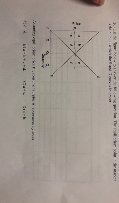 On the graph below, Q represents the quantity of the good and P represents the good's price. ____ 12. Refer to Figure 7-3. If the price of the good is $6, then consumer surplus is a. $4. b. $6. c. $8. d. $10. ____ 13. Ally mows lawns for a living. Ally's out-of-pocket expenses (for equipment, gasoline, and so on) plus the PLAY. Refer to the diagram. Assuming equilibrium price P1, consumer surplus is represented by areas: a + b. asymmetric information. Nice work! You just studied 20 terms! Now up your study game with Learn mode. Assuming equilibrium price P1, producer surplus is represented by areas: graytermite807 refer to the diagram. assuming equilibrium price p1, producer surplus is represented by areas Assuming equilibrium price P1, producer surplus is represented by areas: c + d. Refer to the above diagram. The area that identifies ...