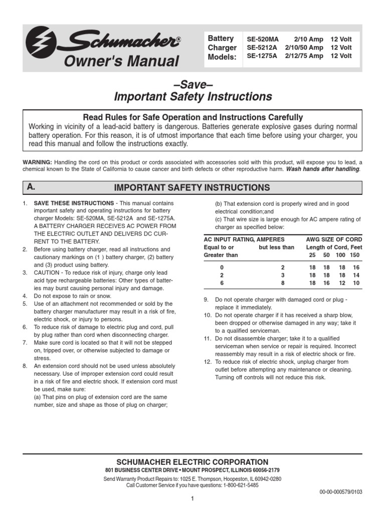 Schumacher SE-5212A Pdf User Manuals. View online or download Schumacher SE-5212A Owner's Manual