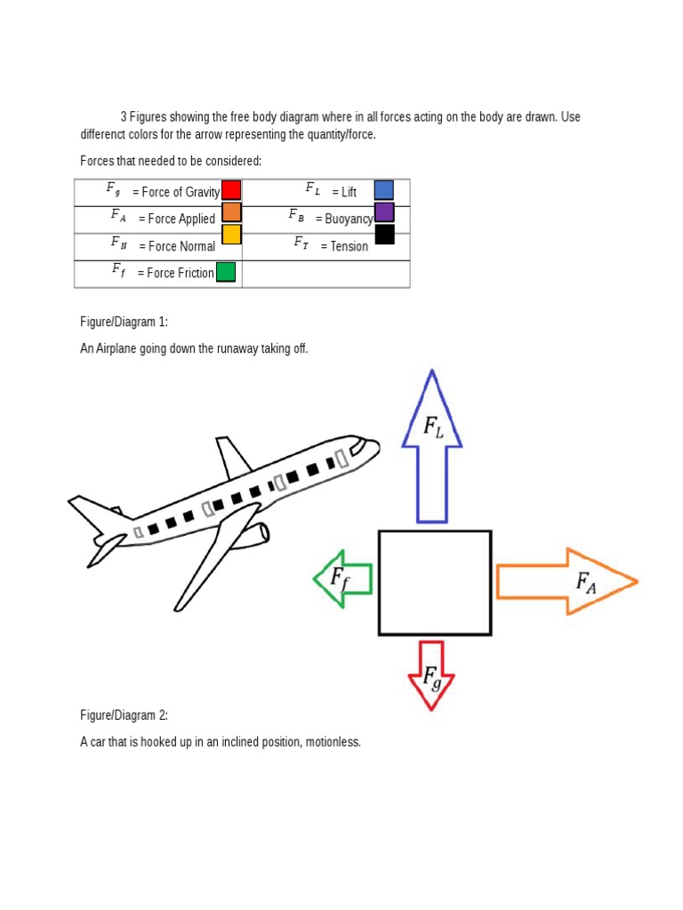 Airplane free body diagram. A free body diagram is defined as an illustration that depicts all the forces acting on a body, along with vectors that are applied by it on the immediate environs. Apart from the acting forces and subsequent work done, the moment magnitudes are also considered to be a part of such diagrammatic representations. Free Body Diagram Questions and Answers. Get help with your Free body diagram homework. Access the answers to hundreds of Free body diagram questions that are explained in a way that's easy for ... A free-body diagram is a diagram that is modified as the problem is solved. Normally, a free body diagram consists of the following components: The number of forces acting on a body depends on the specific problem and the assumptions made. Commonly, air resistance and friction are neglected. This physics video tutorial explains how to draw free body diagrams for different situations particular those that involve constant velocity and constant acc...