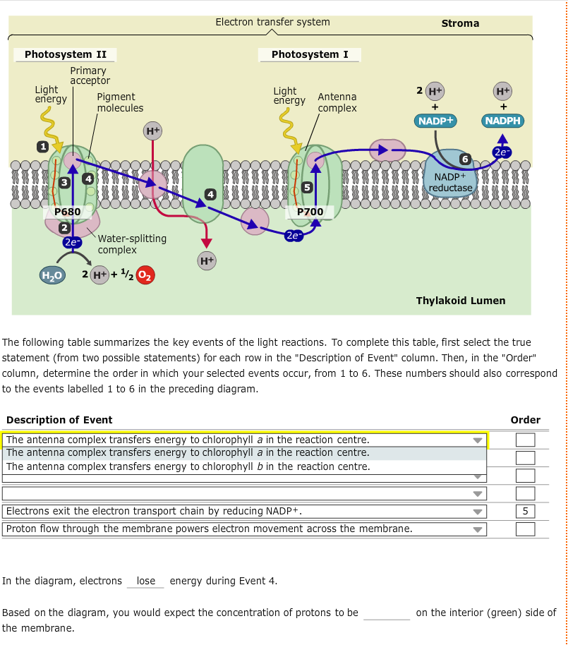 The light-dependent reactions involve two photosytems (II and I) and an electron transport chain that are all embedded in the thylakoid membrane. Light that is harvested from PSII causes an excited electron of the chlorophyll. a. special pair to be passed down an electron transport chain (Pq, Cyt, and Pc) to PSI. The Electron Transport Pathway from Water (H 2 O) to NADP+ (the Nicotinamide Adenine Dinucleotide Phosphate, oxidized form). Many versions of the Z-scheme are available in the literature.This particular diagram was developed by Wilbert Veit and Govindjee, 2000, and can be also found at molecadv.com. ... 1. PHOTOSYSTEM STRUCTURE. 1.1. Brief Overview on the Evolution and Structure of the Plant Photosystem Reaction Centers. ... Most common values to describe the successive reaction leading to oxidation of Pheo – and reduction of Q A, are in the range of 2-10 ns-1 (e.g., 62, 201, 209-211, 215, ...