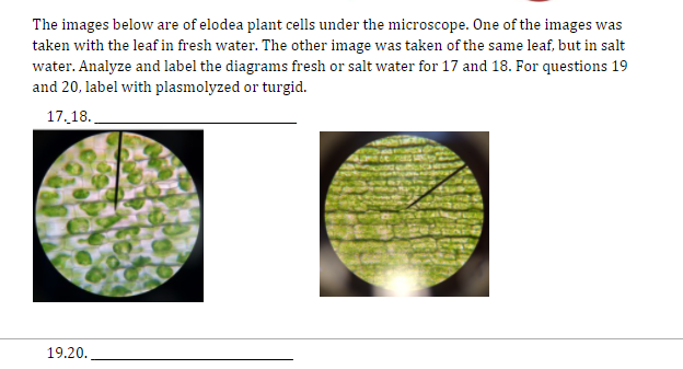 Prepare a wet mount of one leaf from the water plant Elodea using the water in which it is kept. Observe the cells under normal conditions, and make a sketch of what you see. While observing the leaf under the microscope, wick a solution of 6% NaCl (sodium chloride) across the slide.