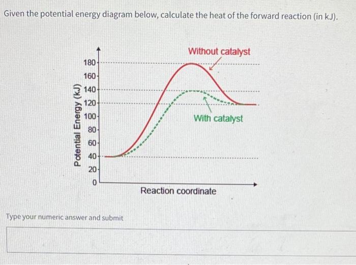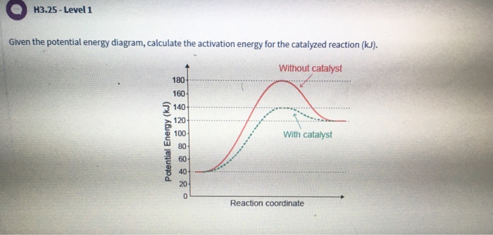 Transcribed Image Textfrom this Question. H3.25-Level 1 Given the potential energy diagram, calculate the activation energy for the catalyzed reaction (kJ). Without catalyst 1801 160 140 120 100 80 60 40 With catalyst 0. 20 Reaction coordinate.