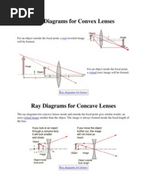 In a ray diagram, a convex lens is drawn as a vertical line with outward facing arrows to indicate the shape of the lens. The distance from the lens to the ... For a Concave lens,There are only 2 casesThey areObject is Placed at InfinityObject is Placed between Infinity and Optical CenterCase 1 ...