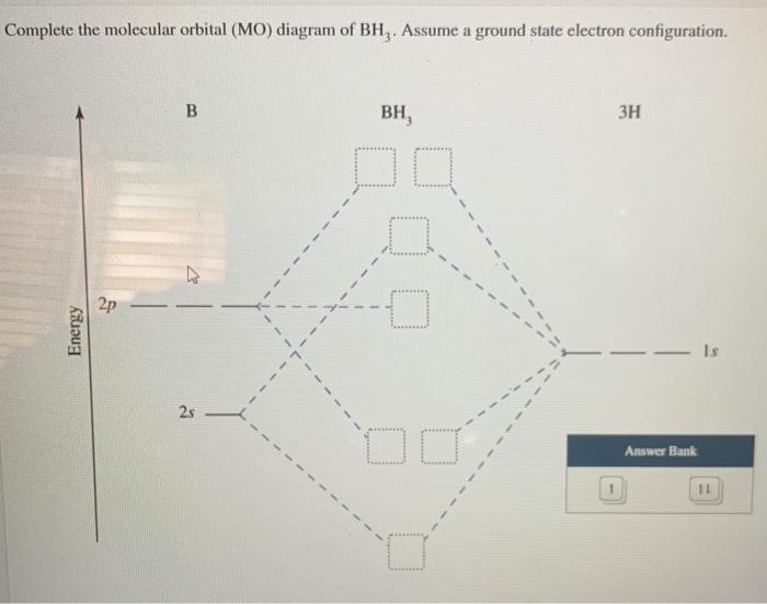 Complete the molecular orbital (MO) diagram of BH3. Assume a ground state electron configuration. Question: Complete the molecular orbital (MO) diagram of BH3. Assume a ground state electron configuration.