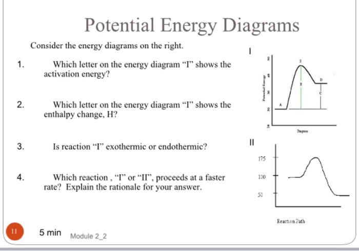 1 | Potential Energy Diagrams Worksheet Potential Energy Diagrams Worksheet CK-12 Foundation Chemistry Name Use the following Potential Energy Diagram to answer questions 1 - 12. 150 100 Potential Energy X2+Y2 50 Progress of Reaction 1. Is the overall reaction as shown exothermic or endothermic? 2.
