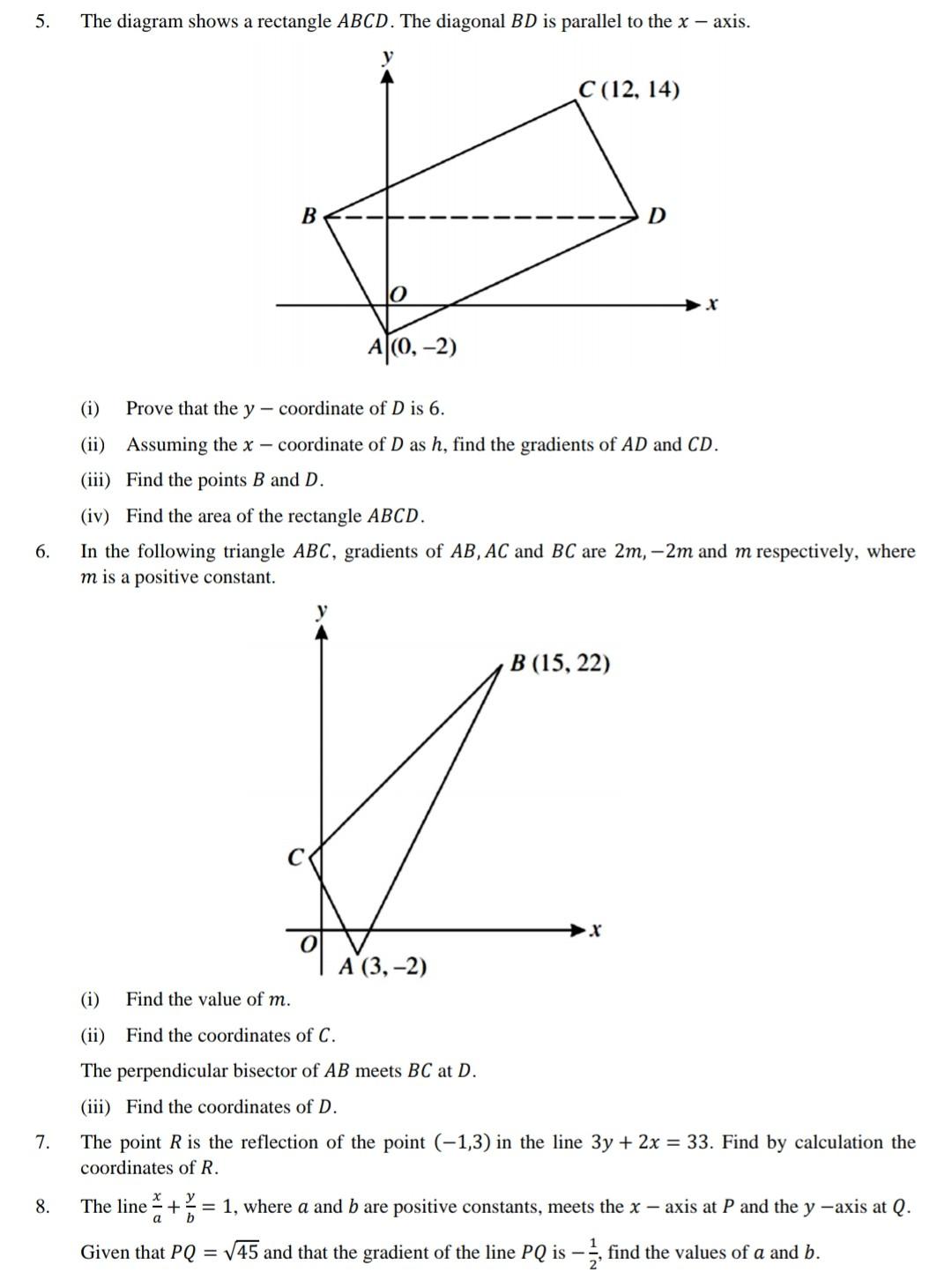 20. The diagram shows points A, B and C lying on the line 2y = x + 4. The point A lies on the y-axis and AB = BC. The line from D(10, 3) to B is perpendicular to AC. Calculate the coordinates of B and C. [7] [Nov 2009 Q9] The diagram shows a rectangle AD. The point A is (0, −2) and is (12, 14). The diagonal BD is parallel to the x-axis. 1) a reflection over the shorter diagonal 2) a reflection over the longer diagonal 3) a clockwise rotation of 90° about the intersection of the diagonals 4) a counterclockwise rotation of 180° about the intersection of the diagonals 10 Given MN shown below, with M(−6,1) and N(3,−5), what is an equation of the line that passes 4) In rectangle ABCD, the diagonals intersect atE. The length of AE is represented as 3b + 1 and the length of DE is represented as 4(2b — 6). 3 The accompanying diagram shows quadrilateral BRON, with diagonals NR and BO, which bisect each other at X. Prove: BNX ≅ ORX 4 Given: PROE is a rhombus, SEO, PEV, ∠SPR ≅∠VOR Prove: SE ≅EV 5 Given: parallelogram FLSH, diagonal FGAS, LG⊥FS, HA⊥FS Prove: LGS ≅ HAF