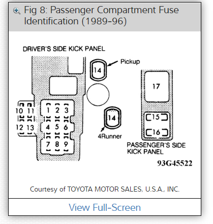 Nov 15, 2019 — SOURCE: 1991 toyota pickup lost fuse panel cover. from the bottom with fuse 1 being closest to the door 1 - Radio 7.5A , Wiper 20A , Engine 10A , Next row ...SOLVED: 86 toyota pickup fuse box diagramAug 31, 2019Fuse panel diagram for a 1988 toyota pickupNov 21, 2019Where is the fuse box located in a 1987 toyota pick up?Sep 7, 201986 toyota pickup fuse box diagramJun 9, 2012More results from www.fixya.com motogurumag.com is an online resource with guides & diagrams for all kinds of vehicles. If you look for a fuse box diagram, timing belt diagram, or maybe wiring diagram - this is a place for you. We also have over 350 guides & DIY articles about cars. Toyota 4Runner (N210; 2003-2009)…>> Fuse box diagram (location and assignment of electrical fuses and relay) for Toyota 4Runner (N210; 2003, 2004, 2005, 2006, 2007 ... Toyota 4Runner (1996-1998) Fuse box diagram (fuse layout), location, and assignment of fuses and relays Toyota 4Runner (N180) (1996, 1997, 1998).