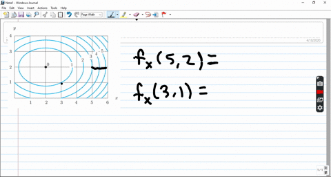 fullscreen Expand. Transcribed Image Text. Approximate f (3, 5) using the contour diagram of f (x, y) shown below. 18 12 10 6 X=2 10. check_circle. (1 point) Approximate f y(1;3) using the contour diagram of f(x;y) shown below. f y(1;3) ˇ Answer(s) submitted: -0.8 (correct) 2. (1 point) Find the partial derivatives indicated. Assume the variables are restricted to a domain on which the function is defined. z= x5 +x y 6: ¶z ¶x = ¶z ¶y = Answer(s) submitted: 6((xˆ5+x-y)ˆ5)*(5*xˆ4+1) 6((xˆ5+x-y)ˆ5)*(-1) (correct) 3. (1 point) Find ... 1. f(x;y) = x+ y, x2 + y2 = 1 We use the constraint to build the constraint function, g(x;y) ... with f= 0. A contour diagram showing the region and contours of fis included below to illustrate the solution. 2. 5.(a)Draw contours of f(x;y) = 2x+ y for ... as shown below. (b)Overlaying the constraint, we are allowed to move on a circle of radius ... Okay, so we want to ask to meet ah the partial derivative of F with respect to X at the 0.3 comma five. And so at this point right here is Has coordinates 3:05. Now, if we want to estimate the partial derivative with respect to X, then from this point we want to move in the direction of the X axis until we arrive at the next contour line. And and so the partial derivative F with respect to X ...