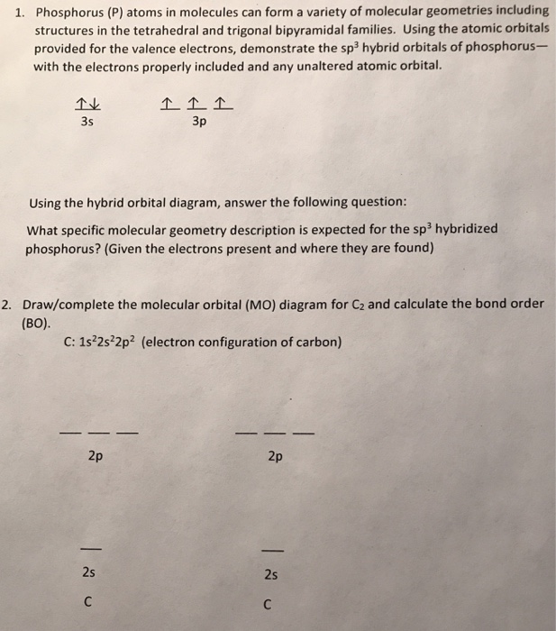 To write the orbital diagram for the Phosphorus atom (P) first we need to write the electron configuration for just P. To do that we need to find the number... Electron orbital diagrams and written configurations tell you which orbitals are filled and which are partially filled for any atom. The number of valence electrons impacts on their chemical properties, and the specific ordering and properties of the orbitals are important in physics, so many students have to get to grips with the basics. What is the orbital diagram for phosphorus? Orbital Diagrams: Orbital diagrams show the distribution of electrons in the electron shells and subshells of an atom. A few principles and rules must be... Ab initio LCAO‐MO‐SCF calculations for several typical molecules containing phosphorus have been undertaken to study the role of phosphorus 3d orbitals in the bonding. It is emphasized that the discussion about the 3d orbital participation in bonding should be based on a reasonable choice of basis sets and it seems suitable to choose the atomic orbitals in proper molecular environment as ...