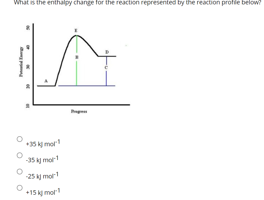 which of the following enthalpies of reaction would the ... The x-axis represents the reaction progress. Chemical reactions proceed (or are read) from left to right. Therefore, looking at the potential energy diagram, ...1 answer · 3 votes: In chemical reactions, the internal energy represents the total energy of the system and is often called Enthalpy. The x-axis represents the reaction progress. ...
