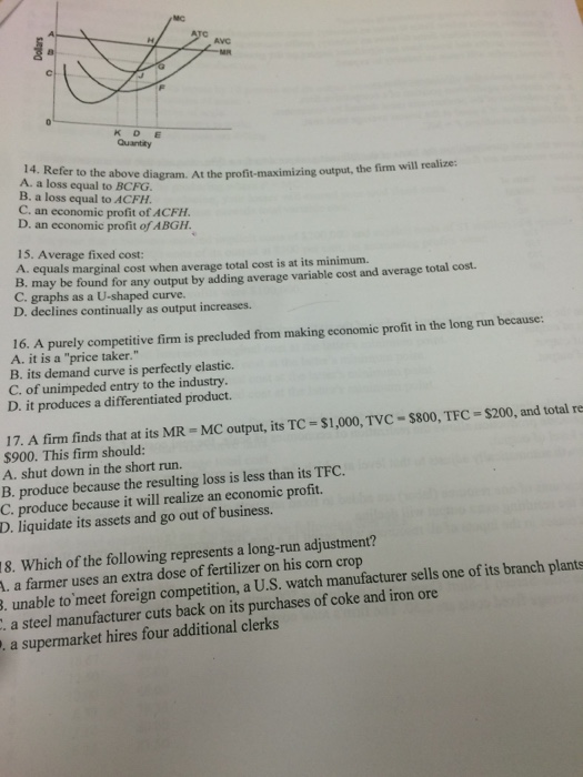 Refer to the above diagram. At the profit-maximizing output, the firm will realize: A. a loss equal to BCFG. B. a loss equal to ACFH. C. an economic profit of ACFH. D. an economic profit of ABGH. 15. Average fixed cost: A. equals marginal cost when average total cost is at its minimum. B. may be found for any output by adding average variable ...