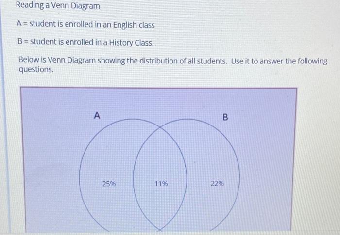 Reading a Venn Diagram A= student is enrolled in an ... Transcribed image text: Reading a Venn Diagram A= student is enrolled in an English class B = student is enrolled in a History Class. Below is Venn Diagram showing the distribution of all students. Use it to answer the following questions. А B 25% 11% 22% A) If a student is chosen at random, what is the probability they are in an English class? Venn Diagram For Reading Worksheets & Teaching Resources | TpT 3. $3.00. PDF. This includes a one-page reading passage suitable for Grades 1-3, as well as a venn-diagram page. It explains the characteristics of both fiction and non-fiction texts. Students then use the information from the reading passage to complete the venn-diagram. This is a great in-class activity or ho.