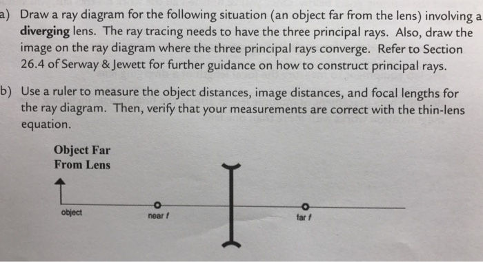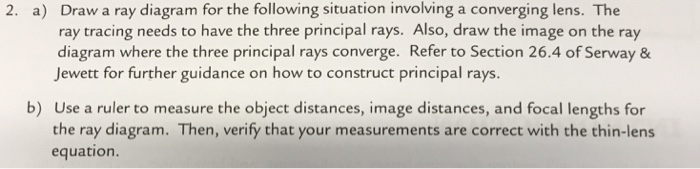 a) Draw a ray diagram for the following situation involving a) Draw a ray diagram for the following situation involving a converging lens. Subject: Physics Price: 2.85 Bought 3. Share With. a) Draw a ray diagram for the following situation involving a converging lens. The a) ray tracing needs to have the three principal rays. Also, draw the image on the ray diagram where the three principal rays converge. EOF