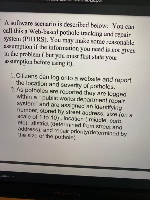 PRESSMAN BOOKS QUESTION SOLUTION Chapter 1 - Academia.edu Develop a swimlane diagram for one or more aspects of PHTRS Step 1 of 3 The department of public works for a city has decided to develop a web-based Pot Hole Tracking and Repair System (PHTRS). One of the use case scenario for the system is:- Use Case: Report Pothole Primary Actor: Citizen Goal in Context: To report a pothole with damage to ...