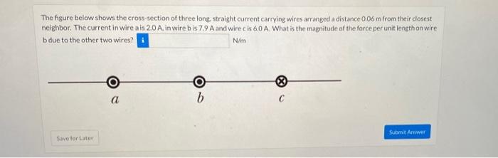 11 13 x 12 The cross-section diagram shows three long 11 13 x 12 The cross-section diagram shows three long, parallel wires. We will compute the force on a 10 m length of wire 1. Current 11 = 16 A is directed ...1 answer · 7 votes: 1 Bat r. І. 2 ته Ig l = 0.4 r = √(0.4) + (04) (04) 5,0.56 m Now magnetic field at a distanee ri do to any long Wire i) B = M. I 2tr Now Mo I2 RTP ...