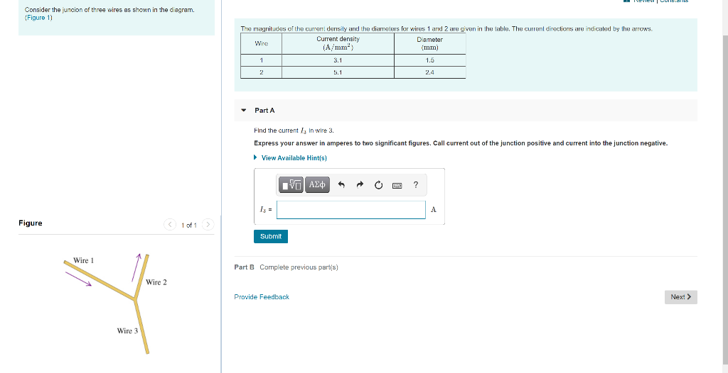 37 consider the juncion of three wires as shown in the ... Transcribed image text: Review Constants Consider the juncion of three wires as shown in the diagram. (Figure 1) The magnitudes of the current density and the diameters for wires 1 and 2 are given in the table. The current directions are indicated by the arrows Wire Current density Diameter (A/mm) 1 22 1.5 2 5.7 3.0 Figure 1 of 1 Part A Wire1 Find the current is in wire 3.
