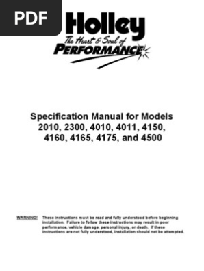 Exploded View and Nomenclature Manual for Models ... - Holley May 26, 2011 · 4160, 4165, 4175, and 4500 WARNING! These instructions must be read and fully understood before beginning installation. Failure to follow these instructions may result in poor performance, vehicle damage, personal injury, or death. If these instructions are not fully understood, installation should not be attempted.