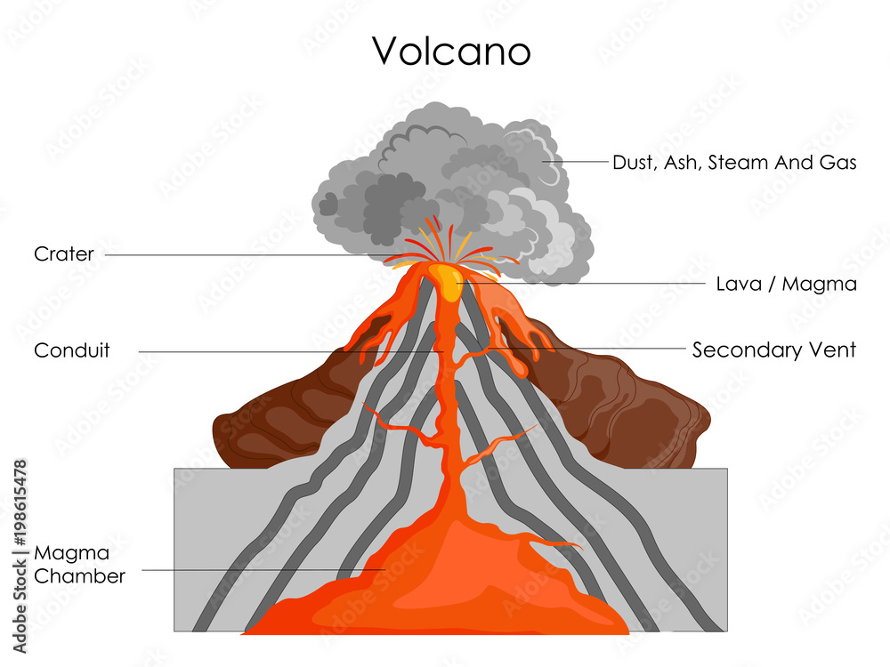 Volcano cross section diagram including all parts magma ... Volcano cross section diagram including all parts magma chamber reservoir rock layers of earth crust conduit branch pipe sill side vent carter throat lava flow ash cloud and parasitic cone for science education. Image Editor Save Comp. Similar Illustrations See All.