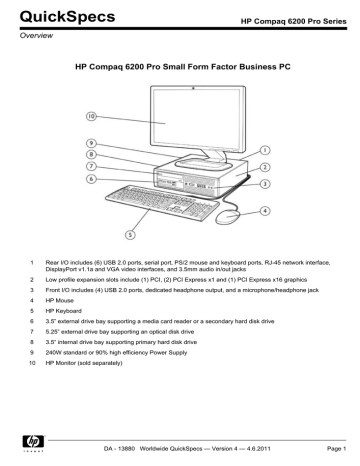 HP Compaq 6200 Pro Microtower PC Specifications | HP ... The HP Compaq 6200 Pro includes (10) USB 2.0 ports, serial port, PS/2 mouse and keyboard ports, RJ-45 network interface, DisplayPort v1.1a, VGA video interfaces with Intel Q65 Express chipset. System specifications. Feature. Description. Processor. Intel Core i7-2600 (3.40 GHz, 8MB cache, 4 cores)