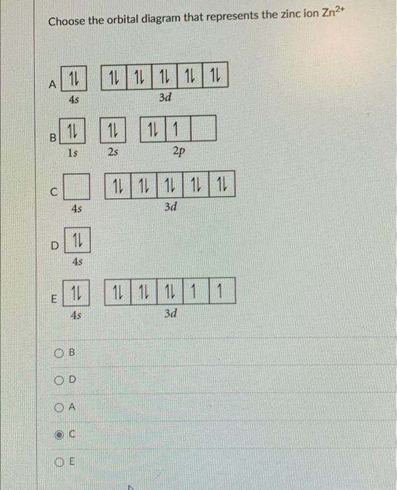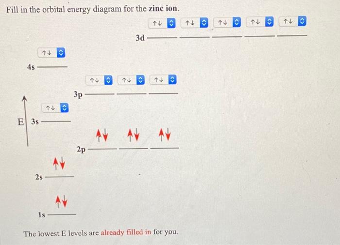 Solved Fill in the orbital energy diagram for the zinc ion ... Expert Answer. Who are the experts? Experts are tested by Chegg as specialists in their subject area. We review their content and use your feedback to keep the quality high. 100% (4 ratings) Transcribed image text: Fill in the orbital energy diagram for the zinc ion The lowest E levels are already filled in for you.