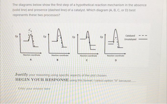 Solved The diagrams below show the first step of a | Chegg.com Question: The diagrams below show the first step of a hypothetical reaction mechanism in the absence (solid line) and presence (dashed line) of a catalyst. Which diagram (A, B, C, or D) best represents these two processes?