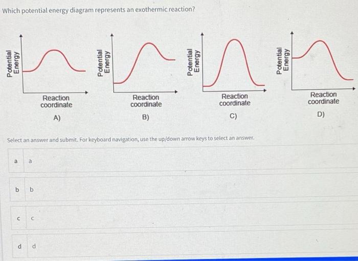 Draw the potential energy diagram for an exothermic ... Draw the potential energy diagram for an exothermic reaction. Explain the terms: activation energy of backward reaction. Updated On: 21-7-2021. This browser does not support the video element. Answer. Step by step solution by experts to help you in doubt clearance & scoring excellent marks in exams. Solved Which potential energy diagram represents an ... Question: Which potential energy diagram represents an exothermic reaction? Potential Energy Potential Energy non Reaction coordinate A) Reaction coordinate B) Reaction coordinate C) Reaction coordinate D) Select an answer and submit. For keyboard navigation, use the up/down arrow keys to select an answer. a a b b с c d d Which potential ... PDF Potential Energy Diagrams potential energy diagrams are a visual representation of potential energy in a chemical reaction note the x axis is usually reaction cordinate or time ... exothermic (loss of energy) if reactants have less energy then products, the reaction is endothermic (gain of energy) Representing endothermic and exothermic processes using ... Representing endothermic and exothermic processes using energy diagrams AP.Chem: ENE‑2.B (LO) , ENE‑2.B.1 (EK) Transcript A physical or chemical process can be represented using an energy diagram, which shows how the potential energy of the initial state relates to the potential energy of the final state.